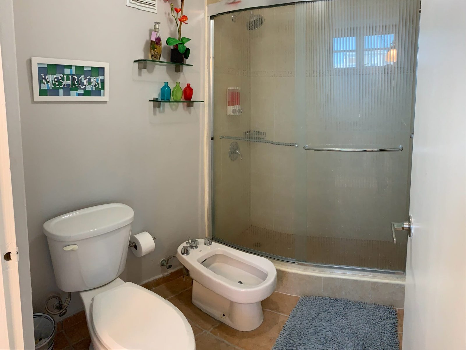 The main bathroom has a glass door shower, a bidet, a ceiling fan, and an elongated toilet. The sink is just opposite the bathroom.
